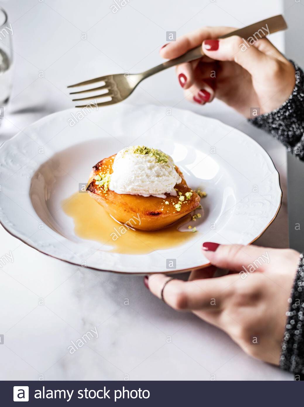 Woman With Dessert On A Plate Baked Quince With Ice Cream And Pistachio Stock Photo Alamy