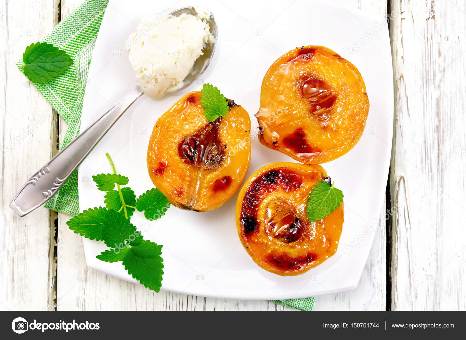 Quince Baked With Ice Cream And Mint In Plate On Board Top Stock Photo C Rezkrr 150701744
