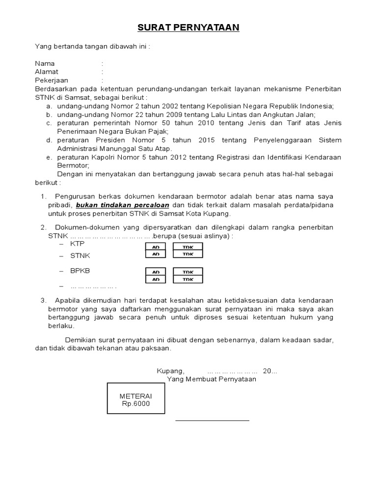 Contoh Surat Pernyataan Blokir STNK Motor / Mobil : Bisa di Download